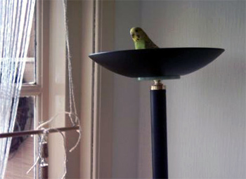 Ollie gaat regelmatig naar buiten en hangt dan aan de waslijn zodat hij kan communiceren met de vogels van