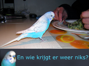 Hier boven is mijn ongevleugelde vriend aan het genieten van een bord raapstelenstamppot. Zoals jullie zien sta ik hongerig en begerig toe te kijken. Het water loopt me in de snavel. Dat lust ik ook wel! Mijn huisgenoten vinden het echter niet goed dat ik een snaveltje meepik van deze dampende Hollandse kost. Ik mag er alleen maar naar kijken en aankomen niet. Niet dat ik me daar veel van aantrek overigens, want ik spring gewoon op de rand van het bord en sla razendsnel toe. Ik prop mijn snavel vol stamppot en ga dat gewoon op een veilige plaats op zitten eten om als het kan even later weer toe te slaan. Meestal krijg ik echter niet de kans om mee te genieten van hun maaltijden, daar ik rond dat tijdstip meestal in mijn kooitje vertoef.