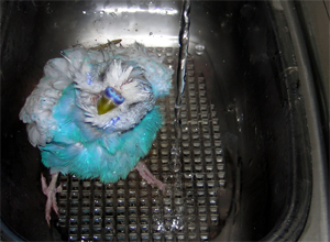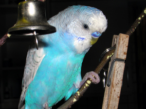 Het kleeft wel hoor, dat eigeel. Er liepen een paar flinke gele strepen over mijn blauwe borstkas. Ook mijn fraaie gevormde poten zaten onder deze lekkernij. Geeft niks, toen mijn verzorger me in de kooi gezet had, heb ik rustig met mijn snavel de restjes van mijn ledematen afgeschraapt en opgegeten. Tja, ik moet goed eten, want ik leid een druk bestaan. Rondjes door de kamer vliegen, beetje knuffelen en af en toe help ik hier in huis wat mee. Nou ja meehelpen......ik fungeer meer als opzichter eigenlijk.