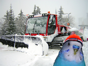 Ik sta hier dan wel voor de grap op de foto met een sneeuwschuiver, maar eerlijk gezegd moet ik er echt niet aan denken....al die sneeuw en die kou! Brrrr! En je zult toch de hele dag zo'n Unox muts moeten dragen zeg! God weet hoeveel rookworsten mijn huisgenoten verslonden hebben om dit oer-Hollandse symbool van vaderlandsliefde te bemachtigen. Nee mensen, winterse oorden spreken me in het geheel niet aan. Geef mij maar een lekkere warme omgeving, een ondernemende parkietenzus en twee gezellige mensen die mij eens heerlijk gaan verwennen! Dat is pas de ultieme vakantie!
