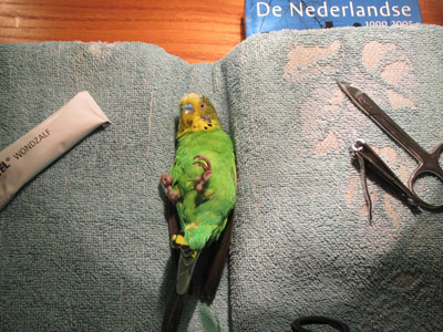 De hele "operatie" verliep goed. Meneer bleef op een gegeven moment rustig liggen en onderging de behandeling zonder al te veel tegenstribbelen. Uiteraard protesteerde en piepte hij wel een beetje, maar ja, dat is begrijpelijk want het is gewoon niet leuk voor een parkiet.